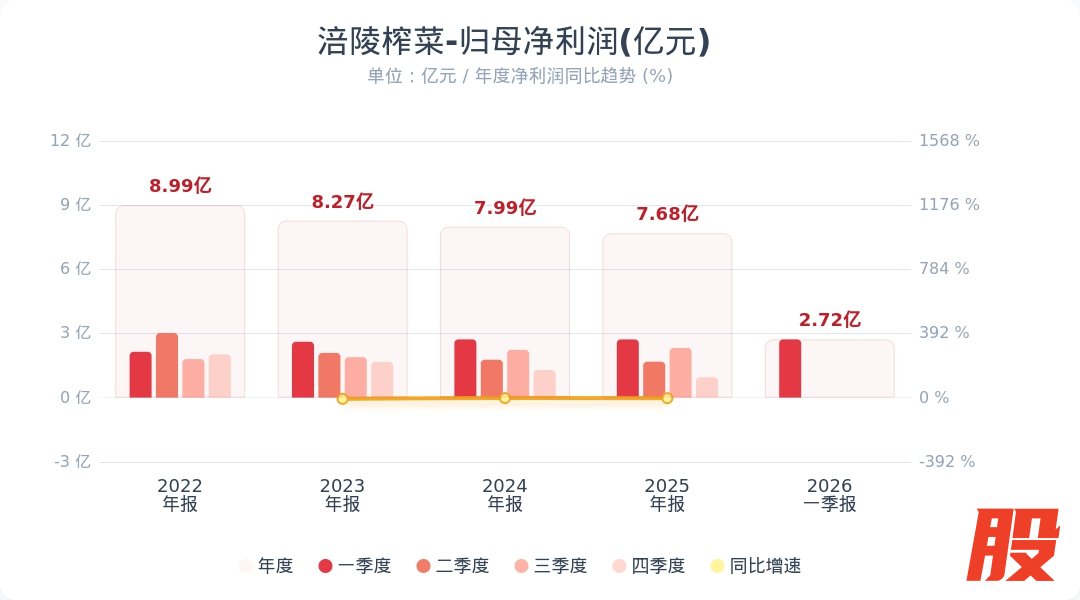 涪陵榨菜(002507.SZ)公告称,2026年第一季度实现营业收入7.54亿元,同比增长5.70%;归属于上市公司股东的净利润为2.72亿元,同比增长0.07%。注:公司Q1净利润2.72亿,2025年Q4净利润0.95亿,据此计算,Q1净利润环比增长186%。