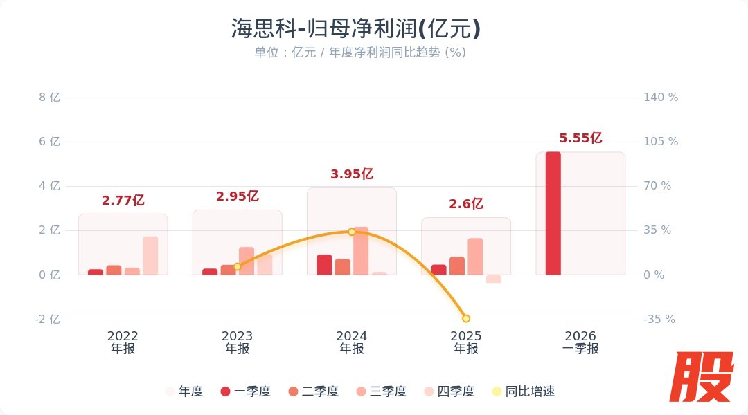 海思科(002653.SZ)公告称,2026年第一季度实现营业收入15.64亿元,同比增长75.33%;归属于上市公司股东的净利润为5.55亿元,同比增长1089.85%。业绩变动主要系本期转让HSK39004项目实现收入约5亿元所致。注:公司Q1净利润5.55亿,2025年Q4净利润-0.36亿,据此计算,Q1净利润环比扭亏为盈。