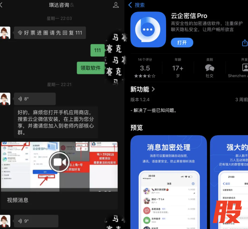 值得注意的是,此类直播平台屡禁不止,在秒封后另一个新的直播间又会马上跳出来。在完成引流后,对方会将上当的投资者从社交媒体引流至微信,再通过微信这个中转站将投资者迅速转移至一个名为“云企密信”的加密聊天软件。